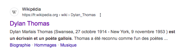 Non seulement le nom “Dylan Thomas” était déjà pris mais en plus, c’était un écrivain, lui aussi. Un poète. Gallois. Et pas n’importe qui… Une pointure du XXème siècle. Comment pouvais-je ne PAS savoir ça? J’étais déçue.